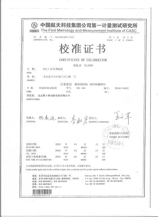 >>恒溫恒濕試驗箱校準證書-航天計量-中國火箭研究院