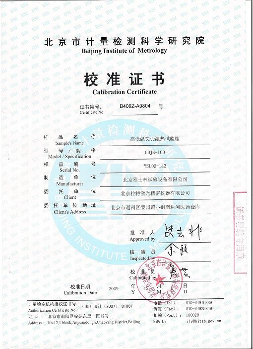 高低溫交變濕熱試驗箱校準證書-北京計量院-拉特激光