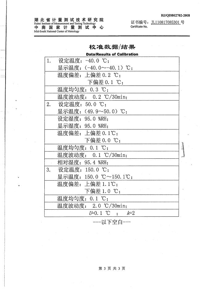 高低溫交變濕熱試驗箱校準證書-湖北計量院-武漢邦迪